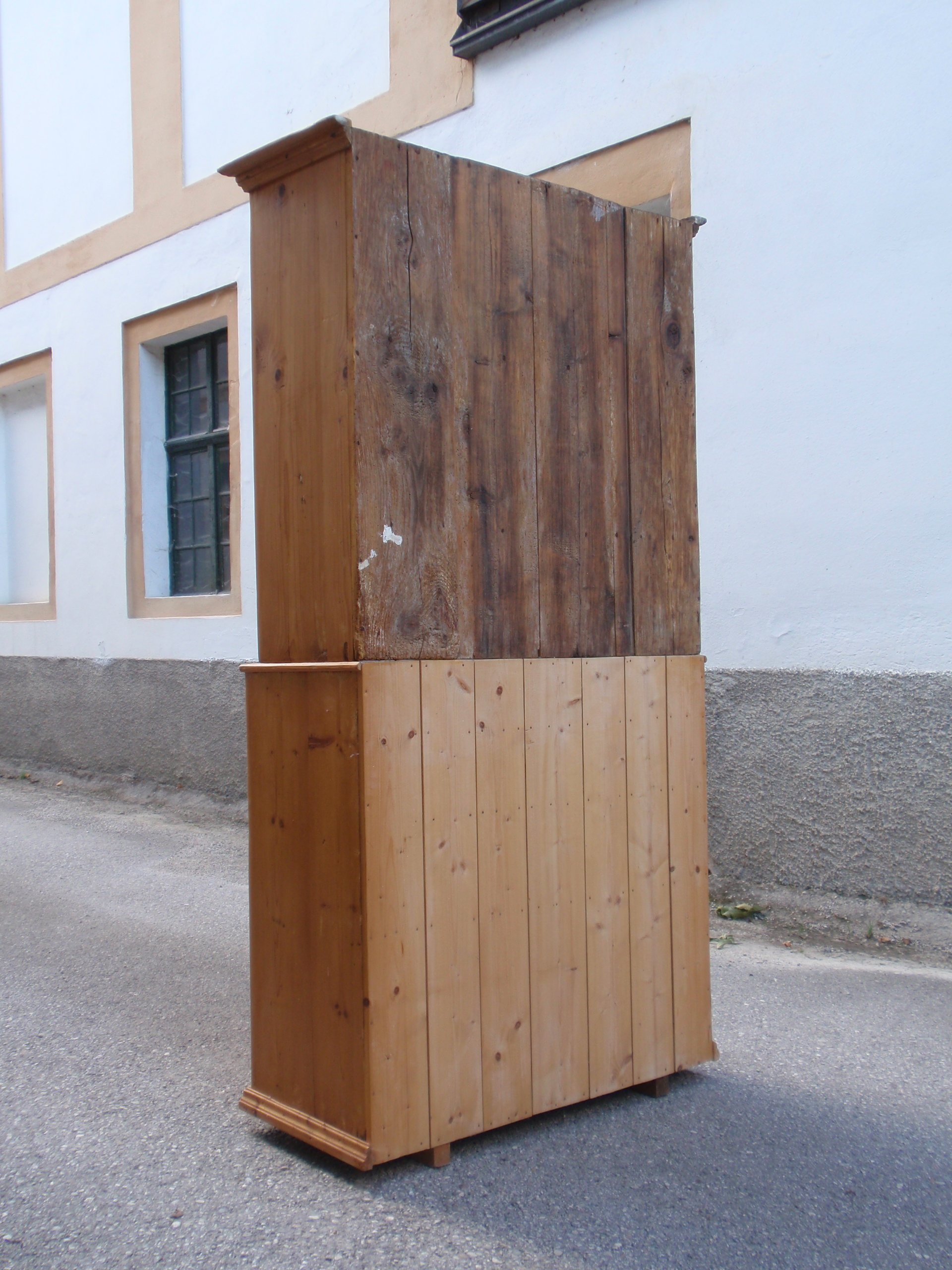 Die Anrichte ist in sehr gutem, dem Alter entsprechenden Zustand und erinnert in Ausführung und Machart an die Möbel aus der Zeit des Biedermeier. Der Unterteil besitzt eine Türe und zwei Laden, die geräumigen Stauraum versprechen. Der Oberteil besitzt zwei verglaste Türen. Schlösser und Schlüssel vorhanden. Die Rückwand des Unterteiles wurde vor einiger Zeit erneuert. Einige Trockenrisse vorhanden aber das stört die Funktion nicht und trägt natürlich zum charmanten Erscheinungsbild dieses bezaubernden Küchenschrankes bei.