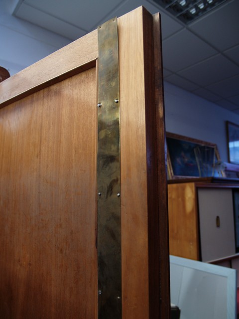 am Schrank, im Inneren gibt's eine Messingblechblende über dem Riegel, diese Blende gehört befestigt.