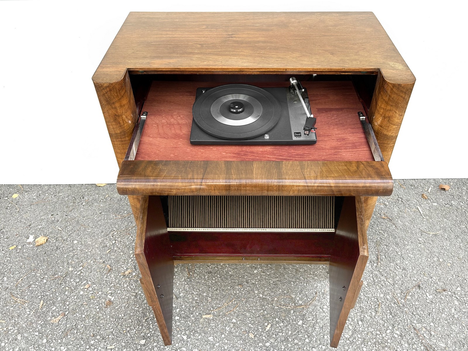 Der eingebaute Plattenspieler Dual 430 ist ein Highlight für Musikliebhaber und Sammler. Der Plattenteller dreht sich, jedoch haben wir keine Boxen zur Hand gehabt, deshalb bieten wir diese antike Musikkommode so an wie hier beschrieben.