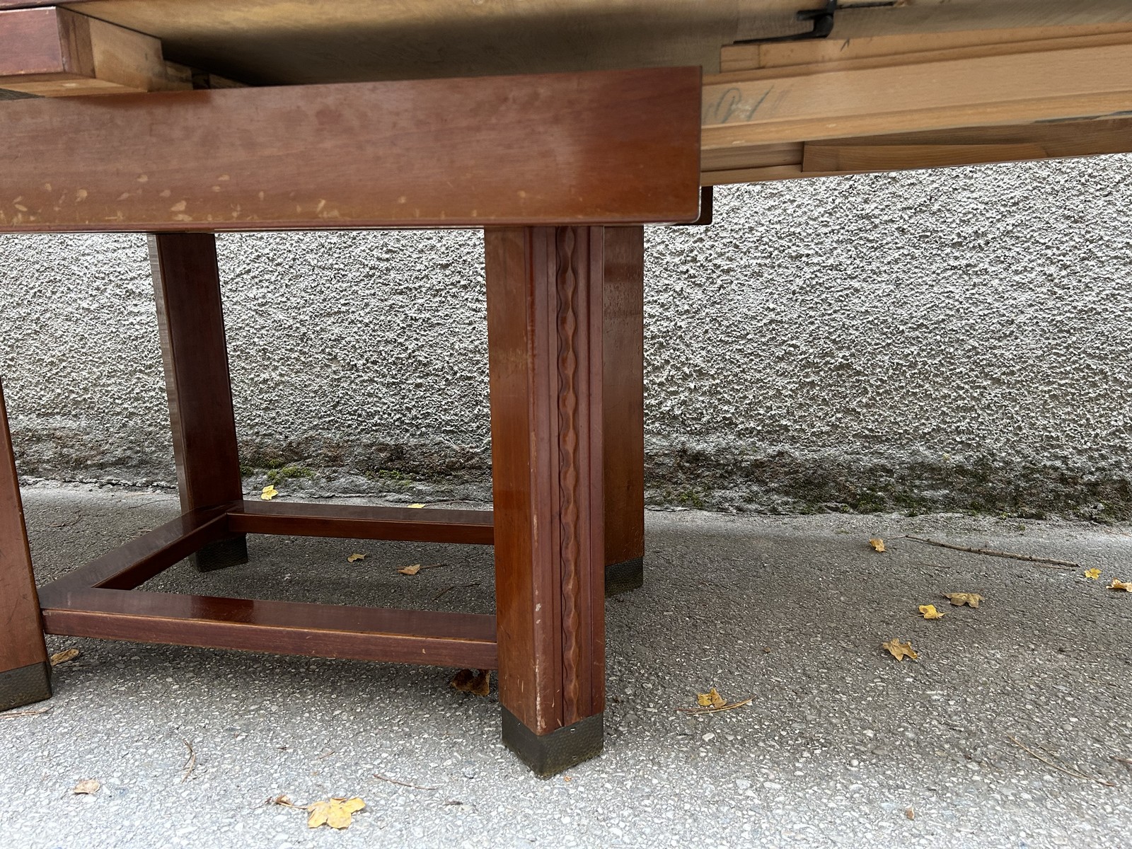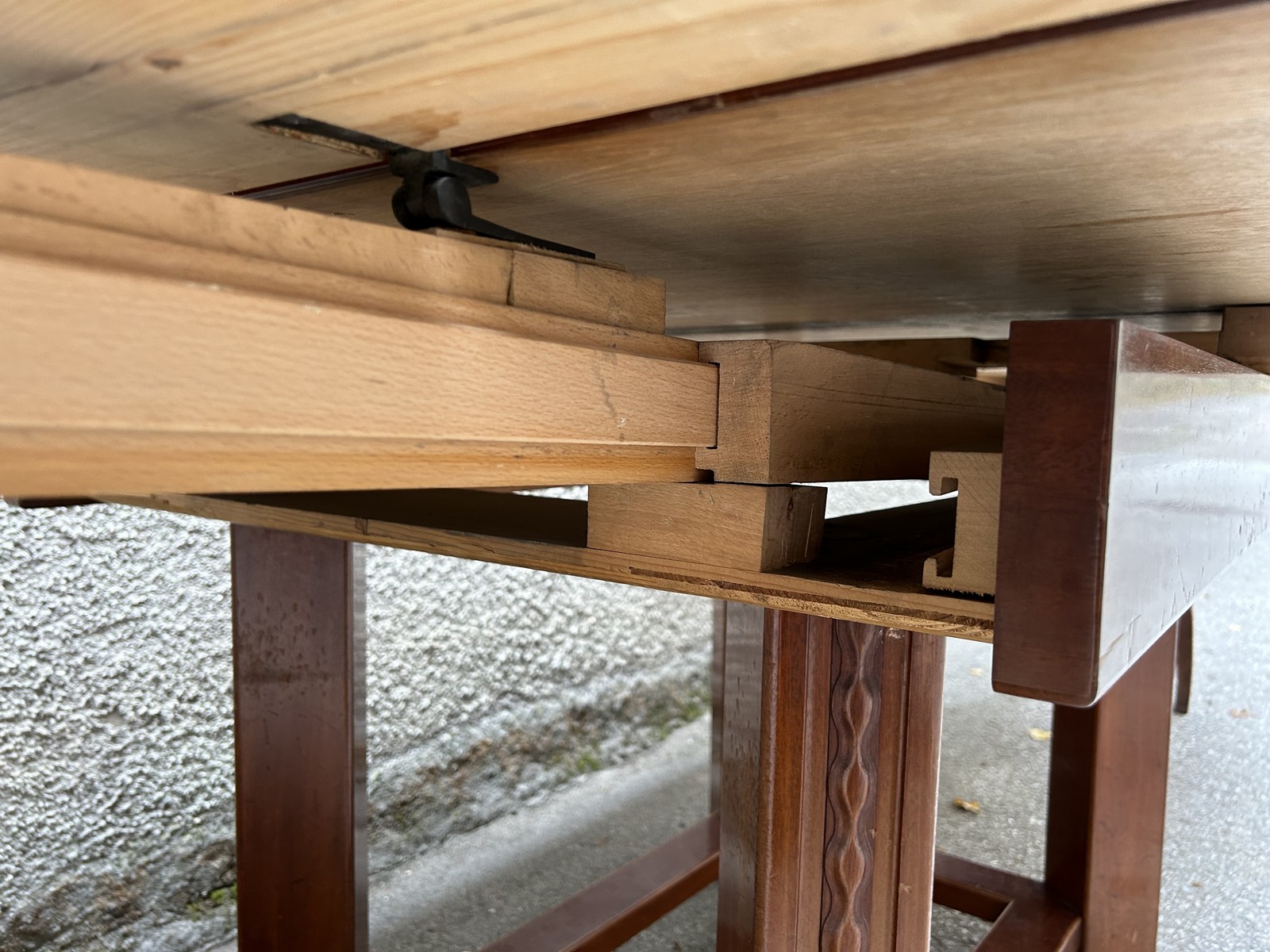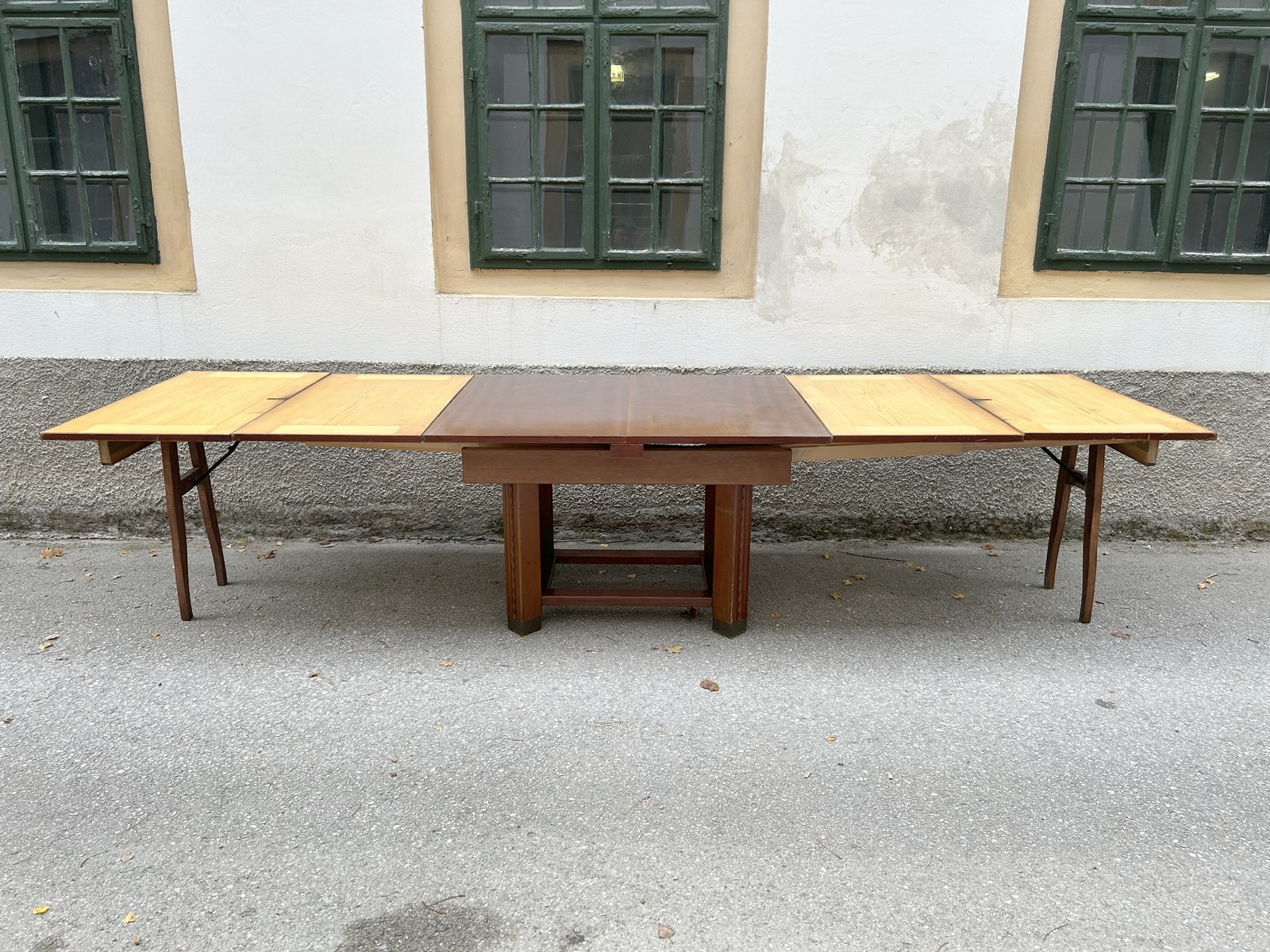 Der Tisch wurde in der Zeit des Jugendstil geschaffen und zeugt von hoher Handwerkskunst vergangener Zeiten. Ein Kulissentisch, der schnell ausgezogen werden kann und somit viel Platz für festliche Tafeln bietet.