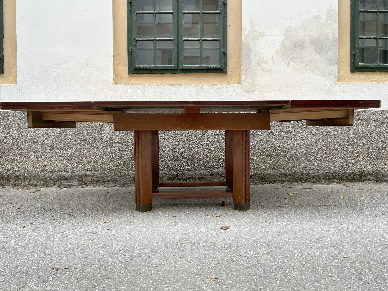 Dieser antike Esstisch wurde um 1910-1920 gefertigt. Der Auszugstisch mit Kulissenauszug lässt sich schnell vergrößern und bietet dann eine Tischplatte von bis zu 300 cm. Die Auszugplatten befinden sich unter der Tischplatte und so ist kein zusätzlicher Platz zum Verstauen der Platten nötig. Die Fertigung ist aufwändig mit Messingschuhen und schräggestellten Standbeinen mit Fußleiste. Kleinere Gebrauchsspuren sind vorhanden aber nicht weiter störend. Eine Abdeckung aus Stoff für die Platte ist vorhanden und wird mitgeliefert (siehe Bilder).