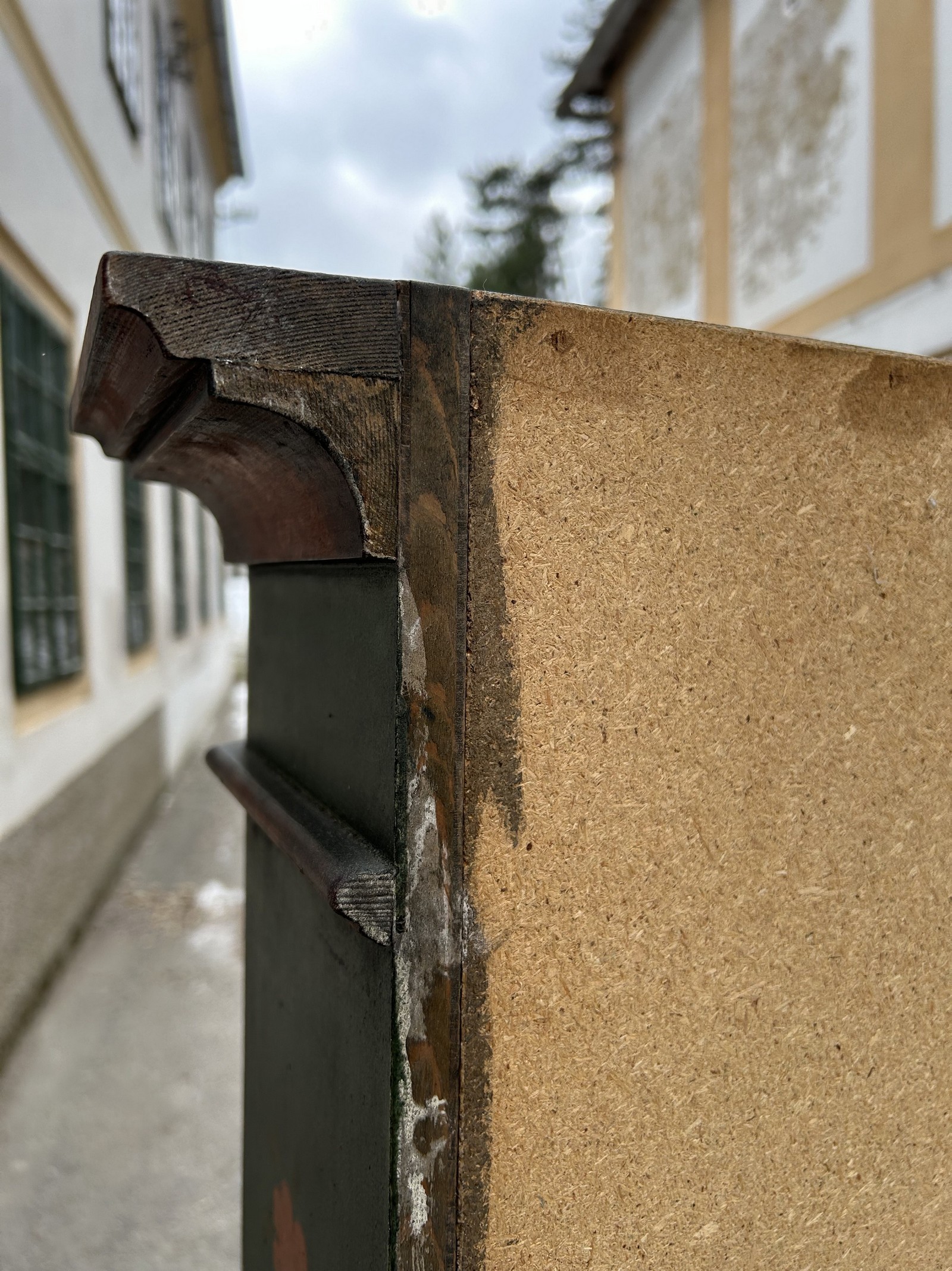 Bauernschrank, Bauernmöbel, Aufsatz Tabernakel mit Heiligenmalerei Bemalter Bauernschrank gefertigt als Tabernakelschrank mit Kommodenunterteil und Aufsatz. Dieses Bauernmöbel wurde einzigartig bemalt, bietet reichlich Stauraum hinter mehreren Laden, einer Tür und geräumige Ablagefläche auf dem Kommodenteil. Das Oberteil Unter gewölbtem Haupt setzen sich mittig ein Türchen mit Holzdrehknauf und an jeder Seite je drei (macht nach Adam Riese 2x3=6) Schubladen ab, welche innen wie außen sauber sind. Der Aufsatz ist für den Transport abnehmbar. Die Standfläche des Aufsatzes zieren Rocaillehörnchen (oder how ever man diese eingedrehten Haxen nennen mag). Der Innenraum ist sauber, frei von Gerüchen und stellt eine absolut selten gute Erhaltung dar. Das Unterteil Im unteren Bereich befinden sich drei Laden welche ebenfalls prakitsch und sehr sauber sind. Mit stattlichen Innenmaßen, verwöhnen diese Schubfächer den Besitzer mit geräumigem Raumangebot, das die Beherbergung von allerhand Sachen ermöglicht. Die Schubladen sind mit güldenen Beschlägen gefertigt und mit Malerei veredelt. Antike Aufsatzkommode im rustikalen Stil Breite ca. 121 cm Höhe ca. 195 cm Tiefe ca. 60 cm Die OptikDoch die Krönung ihrer Schönheit ist das geschwungene Oberteil und die vorkragende Hauptumrandung, die sehr harmonisch die gesamte Vitrine ergänzt und noch viel schöner erscheinen lässt. Die Standbeine des Aufsatzes bietet noch einen zusätzlichen Blickfang, welche den Betrachter vor Neid erblassen lässt. Die Bemalung:Seitlich wie auch frontal wurde nicht an Malerei gespart, was ein Indiz für gute alte Handwerkskunst ist und das Möbel daher an jeder Wand wie auch Nische einen bezaubernden Blickfang darstellt. Im Detail handelt es sich um ornamental, florale Malerei mit traumhaft schönen Blumen / Blümchen, Ranken, Girlanden und geometrische Elemente. An den Seitenflanken der Kommode wurde die Technik der Kräuselmalerei eingesetzt und Malerei in Rahmen gesetzt. Auf den Schubladen schäumt die Malerei von Farbpracht und Details über. Auf der Oberplatte der Kommode kam detailreiche und liebevolle Landschaftsmalerei zum Einsatz. An der Mitteltüre des Aufsatzes wurde die weibliche Darstellung (wobei hier zu vermuten ist, dass es sich um die Hl. Maria / Meryem / Merry handelt) in bezaubernder Art aufgemalt (erinnert ein wenig an den Bauhaus Malstil). Das Alter können wir leider nicht genau bestimmen, auf uns macht dieses prächtige Teil den Eindruck als wäre es in der Biedermeier-/Gründerzeit entstanden und nachträglich bemalt wobei der Aufsatz vermutlich auch nachträglich, um Mitte des letzten Jahrhunderts dazu gefertigt wurde. Weitere Info zu diesem Schrank. Kontaktieren Sie uns für weitere Informationen zu diesem rustikalen Bauernschrank-Einzelstück.