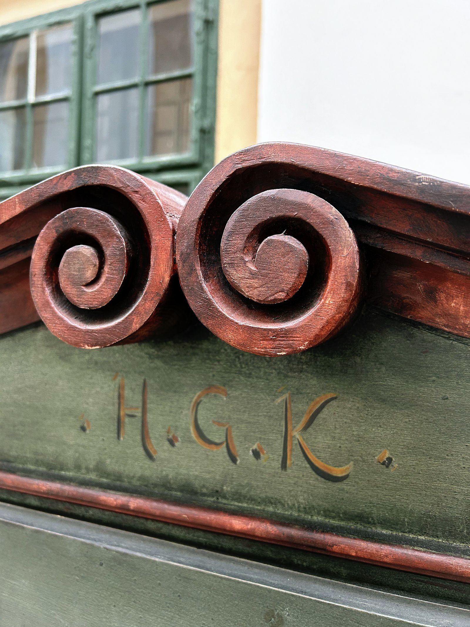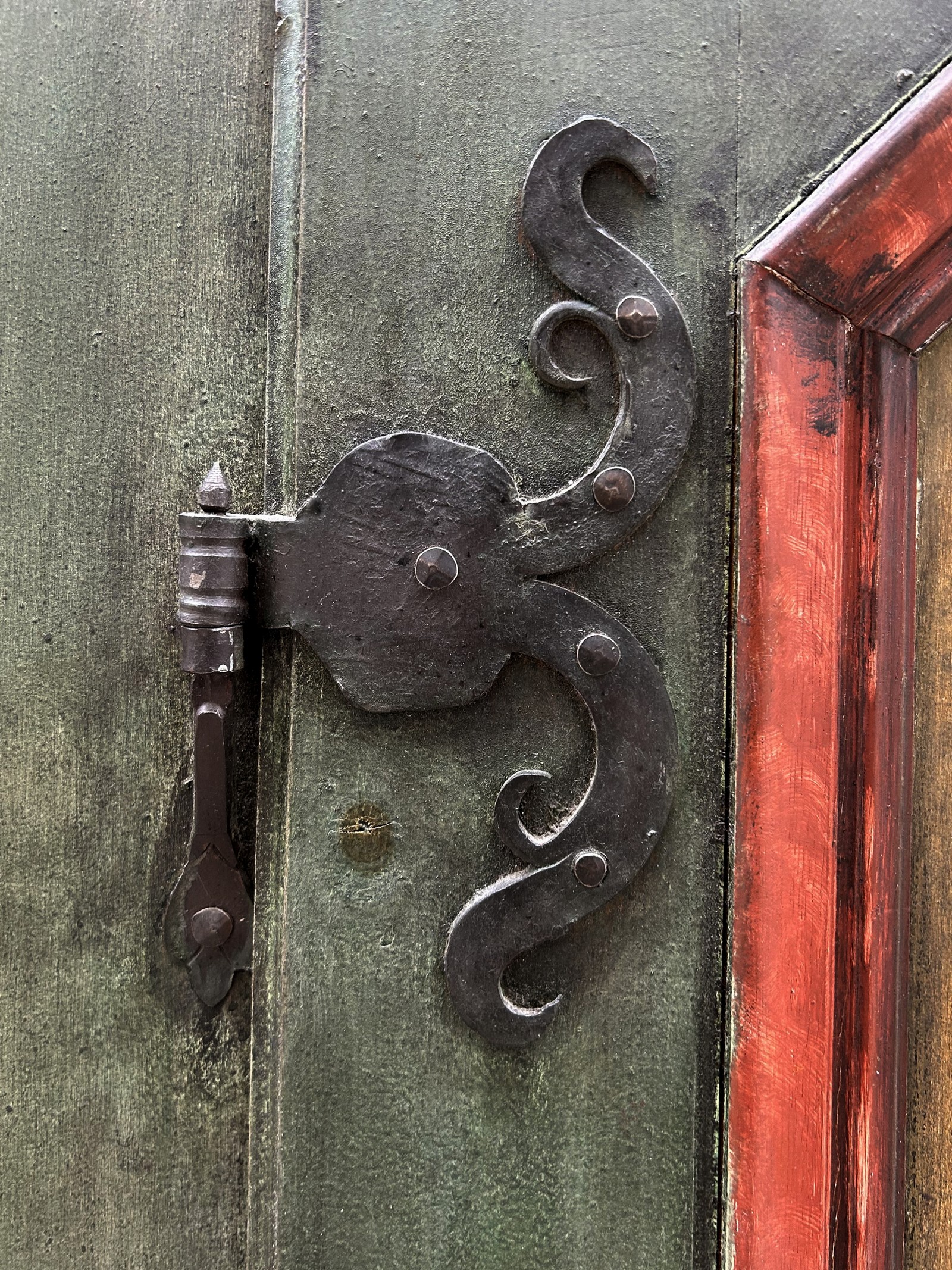 Der Schrank ist eintürig und steht stabil auf Kugelfüßen. Der Schrank zeigt sich in hinreißender Handbemalung mit Motiven der Bauernmalerei. Die Eisenbeschläge sind sehr schön anzusehen und funktionieren tadellos.