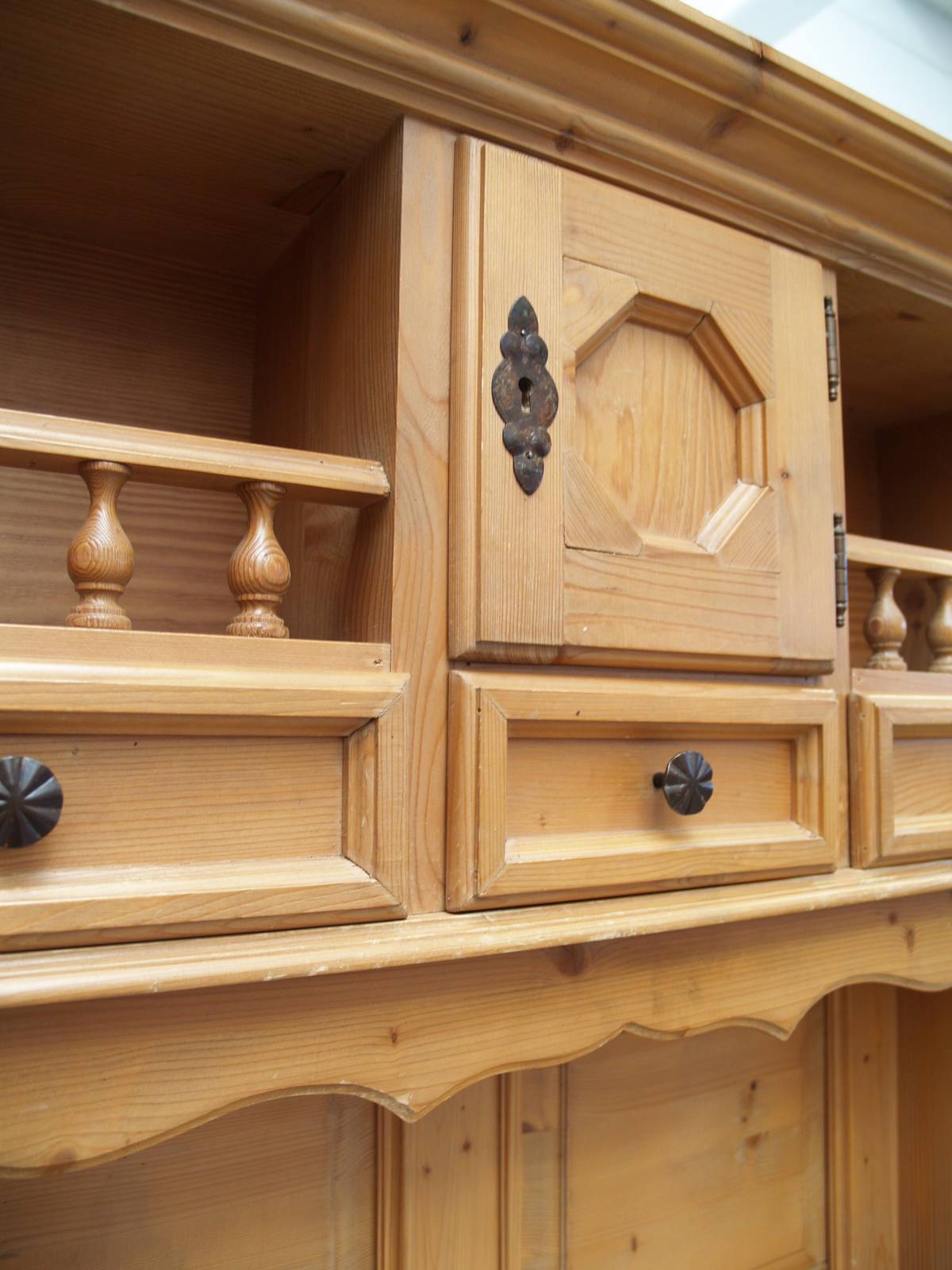 Schrank Massivholz antik, 2-teiliger rustikaler Weichholz Bauernschrank einzigartig schön! Dieser 2-teilige einzigartige antike rustikale Bauernschrank aus massivem Holz wurde um 1880 gefertigt und befindet sich in schönem Zustand Dieser rustikaler Bauernschrank ist mehr als nur ein Möbelstück - er verkörpert Geschichte und Charme vergangener Zeiten. Sorgfältig aus massivem Holz gefertigt, besticht er durch seine Robustheit und Authentizität. Das Massivholzmöbel lässt sich als Gläserschrank oder Geschirrschrank verwenden oder auch als zwei einzelne Kommoden. Details:2-teilige Fertigung mit geschwungenem Gesims;Aufsatz besitzt innen zwei frontgeschwungene Regalfächer und drei Abstellflächen;3-seitig verglast - schau-seitig zwei geätzte Satinglasscheiben mit großem Amphorenmotiv. Kommode bietet viel Stauraum in drei tiefen und breiten Schubladen. Auf unseren Beschreibungsfotos sieht man:Das hier angebotene Bauernmöbel wie es vor und nach der Restaurierung aussah. Die Restaurierung erfolgte unter Erhalt ihrer natürlichen Alters- u. Gebrauchsspuren und natürlich ihrer Ausstrahlung, Fehlende Teile wurden ergänzt und Oberfläche wurde gepflegt. Abmessungen gesamt: ca. 122cm breit, 62cm tief, 203cm hoch Tipp zum Aufsatz:Wir belassen die runden Füße am Aufsatz. Sollte der zukünftige Besitzer keinen Spalt zwischen Ober- u. Unterteil haben wollen, damit das Möbel geschlossen aussieht, kann man die Füße einfach entfernen. Außerdem: Ober- u. Unterteil ließen sich auch getrennt voneinander stellen und verwenden. Dies macht dieses antike Bauernmöbel zu einem praktischen Einrichtungsgegenstand. Der Charme dieses antiken Schrankes wird jedes Zuhause bereichern und einen Hauch von Nostalgie und Wärme verleihen. Seine langlebige Konstruktion garantiert, dass er über Generationen hinweg geliebt und geschätzt wird. Erfüllen Sie sich den Traum von einem rustikalen Schmuckstück mit unserem einzigartigen antiken Massivholz-Bauernschrank. Seien Sie jedoch schnell, denn dieses besondere Stück gibt es nur ein mal. Entdecken Sie die Faszination vergangener Zeiten und holen Sie sich dieses einmalige Unikat in Ihr Zuhause. Bestellen Sie jetzt und bringen Sie den Zauber antiker Möbel in Ihr Leben!
