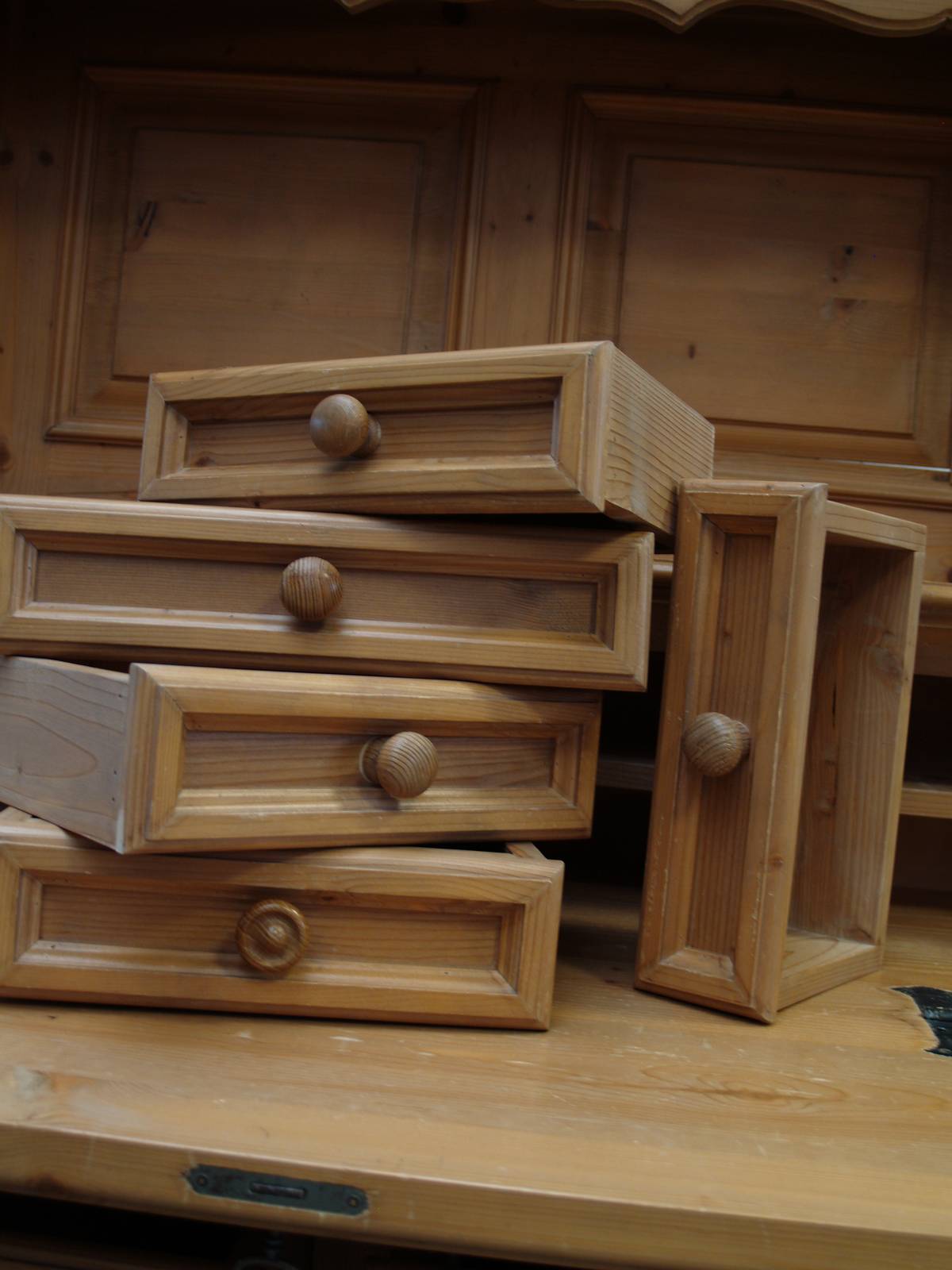Der Schrank ist 2-teilig aufgebaut, was den Transport erheblich erleichtert. Wer das Oberteil nicht verwenden möchte, kann die Kommode auch alleine stellen – sie wirkt auch ohne Aufsatz harmonisch. Die Aufteilung mit verschiedenen Laden und Fächern erlaubt das praktische Aufbewahren von Rezepten, Geschirr, Blumensamen, Schriftstücken oder anderen Gegenständen. Ein echtes Vintage-Highlight mit Seele!
