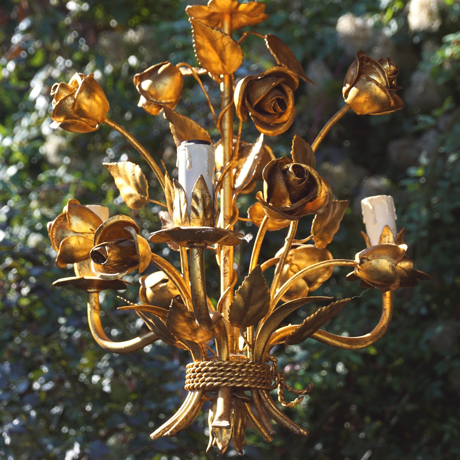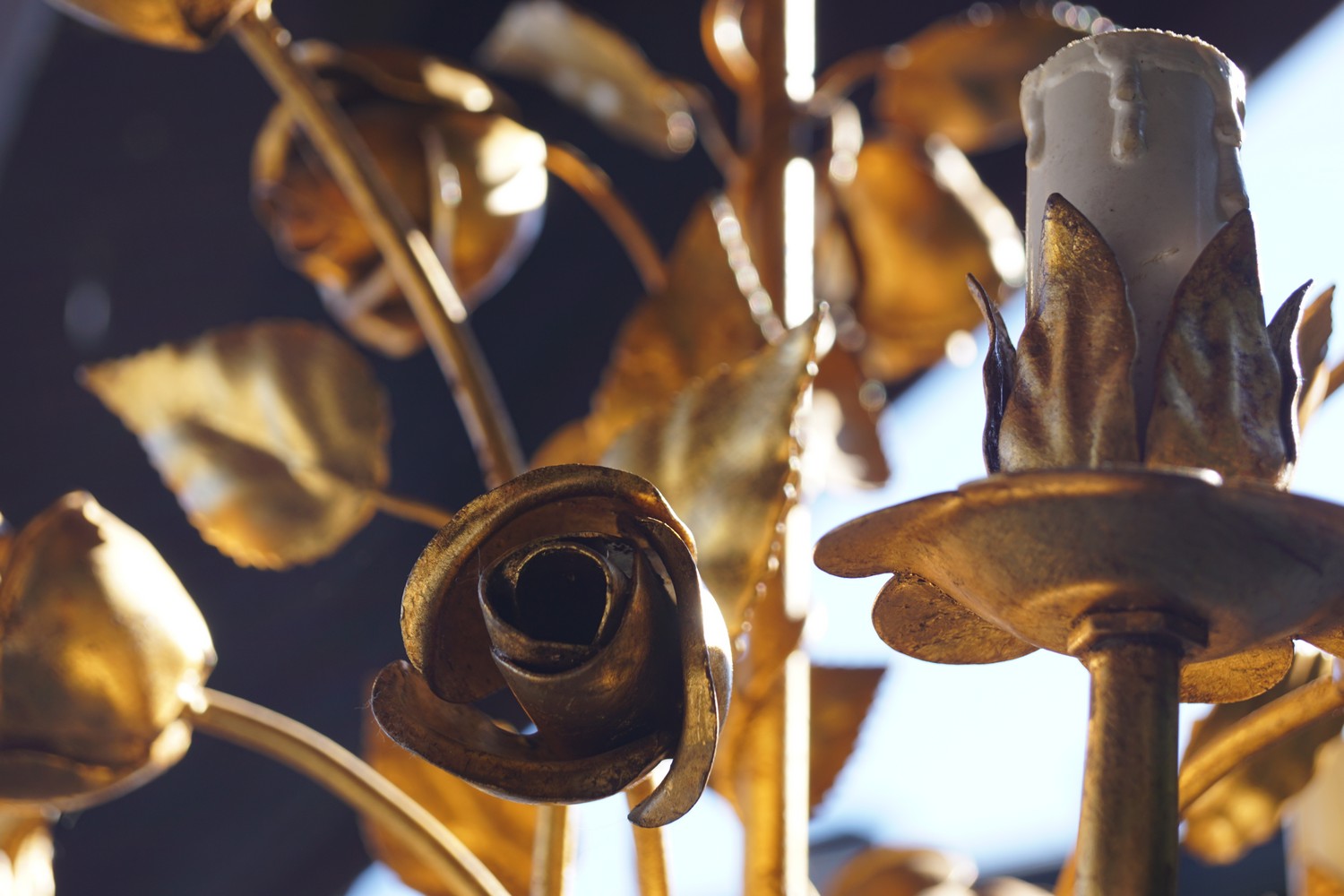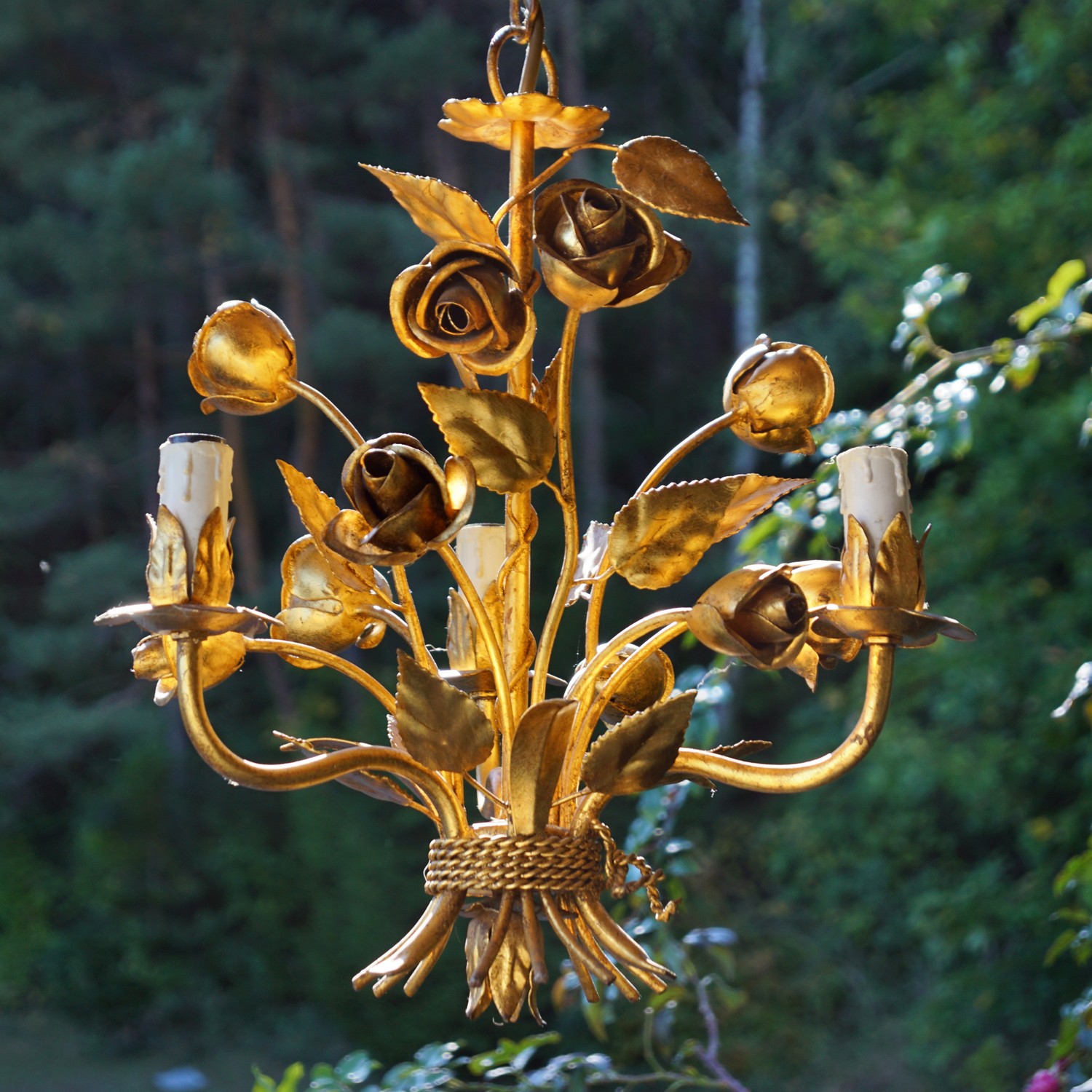 Hängelampe Luster goldfarben Rosenblüten Blätter Leuchter dreiflammig