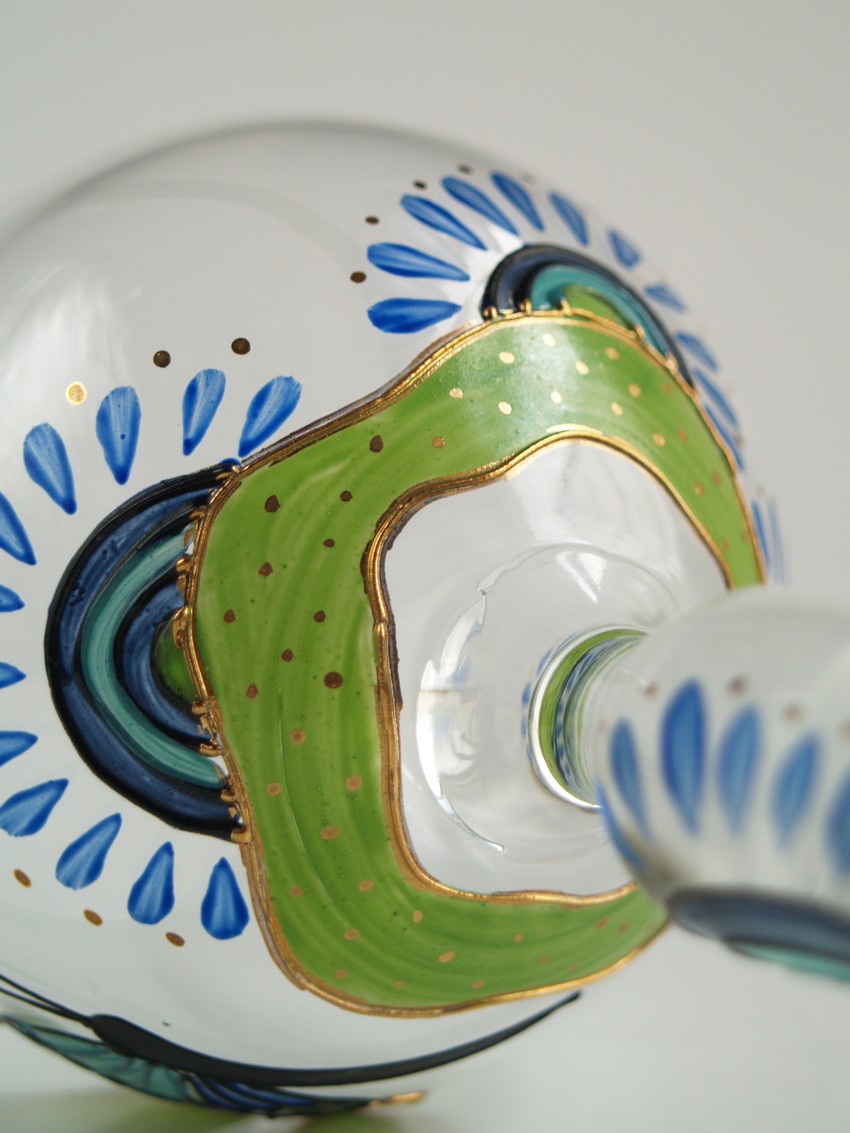 Set - 6 Stk. Weinglas mundgeblasen und von Hand dekoriert - Dekor Löwenherz Jedes einzelne dieser exklusiven Weingläser wurde mundgeblasen und händisch mit feinster Hochemailtechnik filigran veredelt. Das Design stammt von Ulrike Czech. Der elegante, gedrillte und mit rot-grünem Dekor gezierte Schaft mündet in gedrückten Glaskugeln. Die Kuppa zeigt elegante, mehrfarbige Verzierungen in Blatt- und Rautenform, die goldfarben akzentuiert sind und zauberhaft wirken. Die Form der Kuppa öffnet sich am oberen Ende.Die Reinigung der Weingläser sollte per Hand erfolgen. Das garantiert lange Freude am zauberhaften Dekor. Jedes Weinglas ein Unikat, mundgeblasen und handdekoriert. Exklusives Design gepaart mit Handwerkskunst für stilvolle Momente.Absolute Hingucker für jeden Anlass, die gewiss nicht unbeachtet bleiben werden.