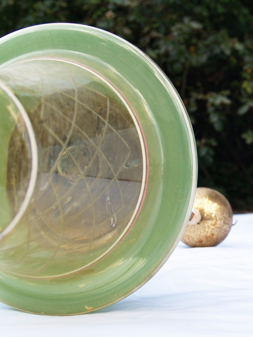 Das Glas ist im Top-Zustand und hat sogar noch ein Etikett (vermutlich vom Hersteller) drauf. Die Metall- und Kordelbereiche zeigen üble Gebrauchsspuren - daher sollte man einfach das Gestänge und das Kordelzeug austauschen.