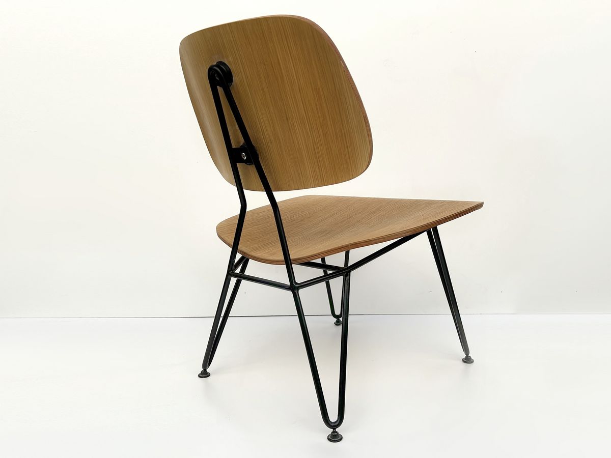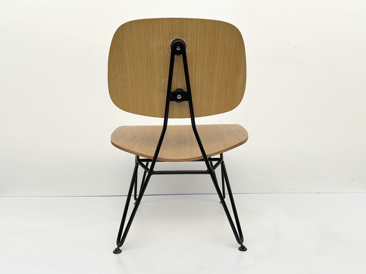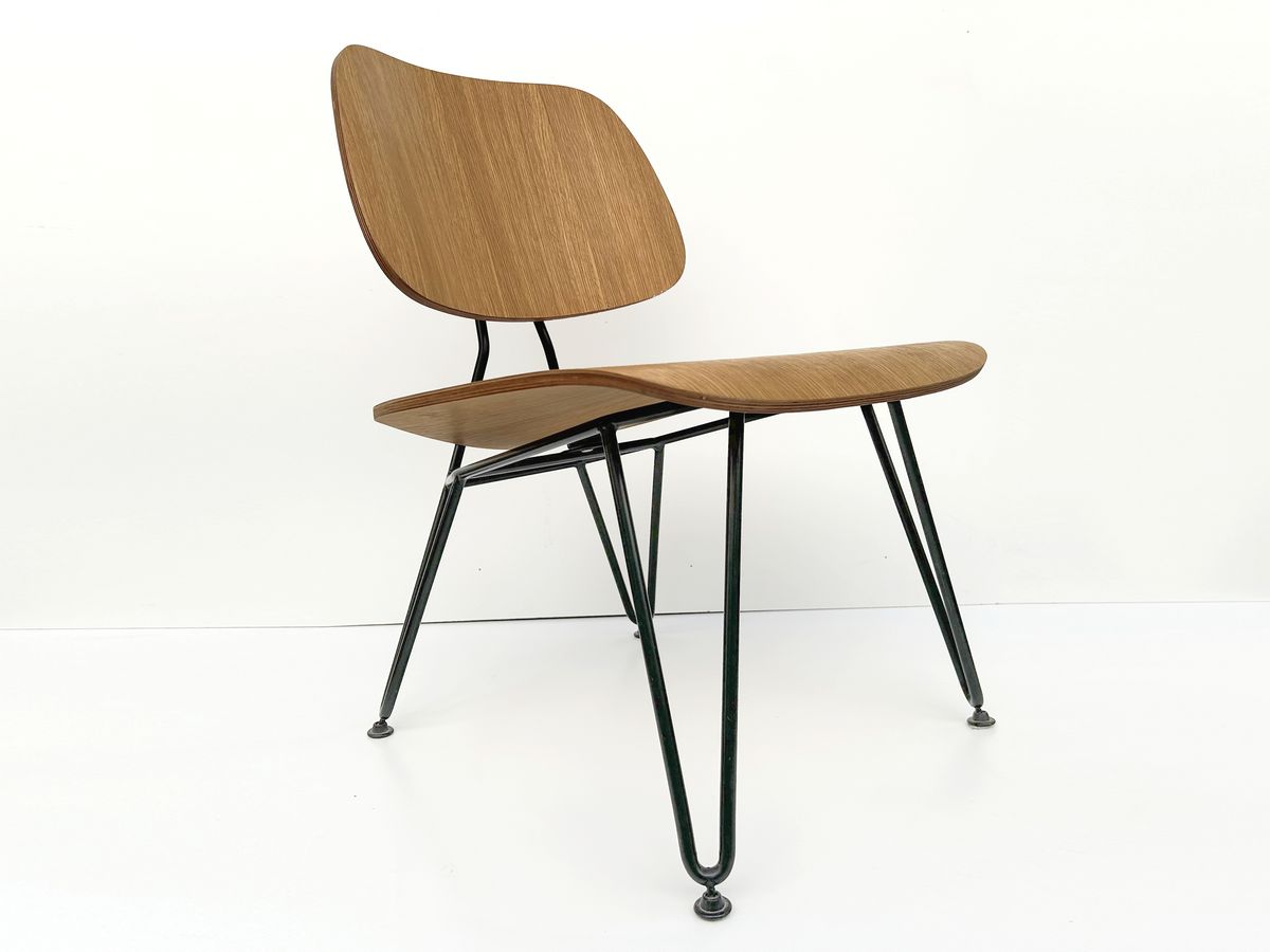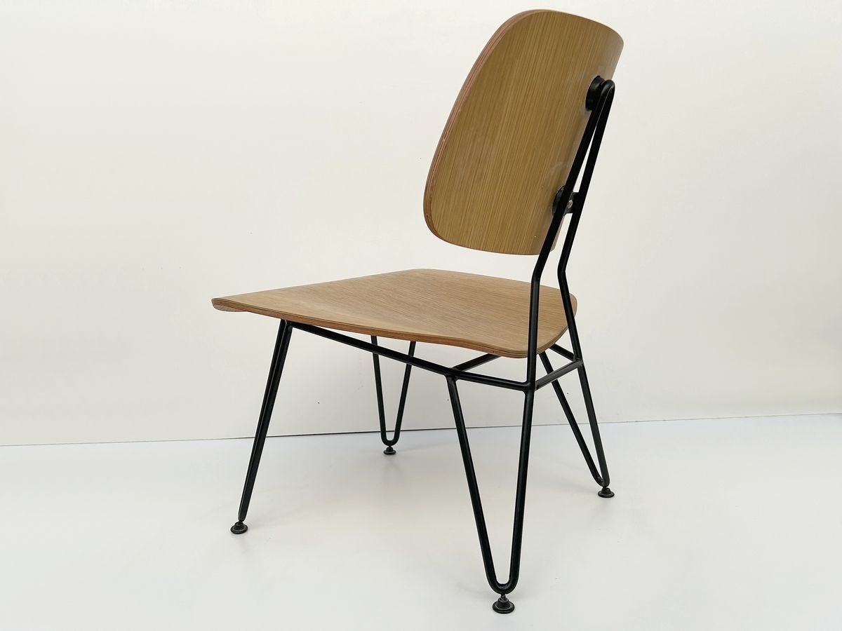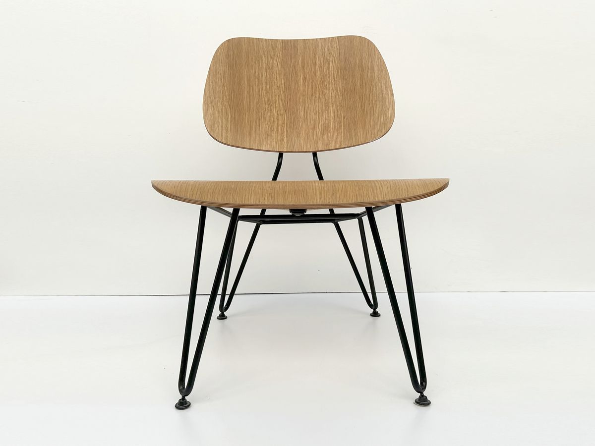 Das warme Holzfurnier verleiht dem Stuhl eine edle Note, während das filigrane Gestell für Leichtigkeit und Stabilität sorgt. Perfekt als Lounge Chair oder Akzentstuhl in Wohn-, Büro- oder Atelierbereichen.