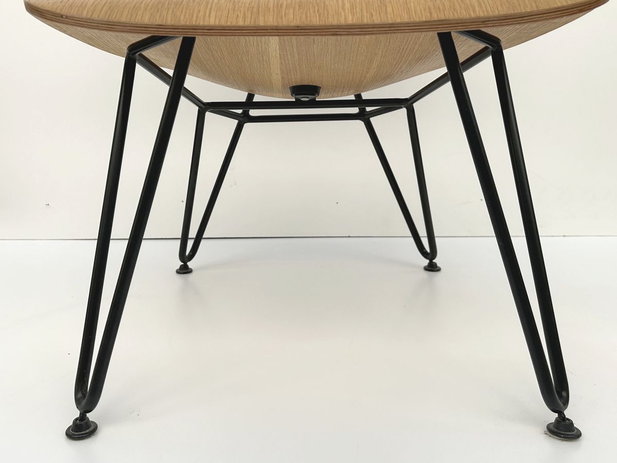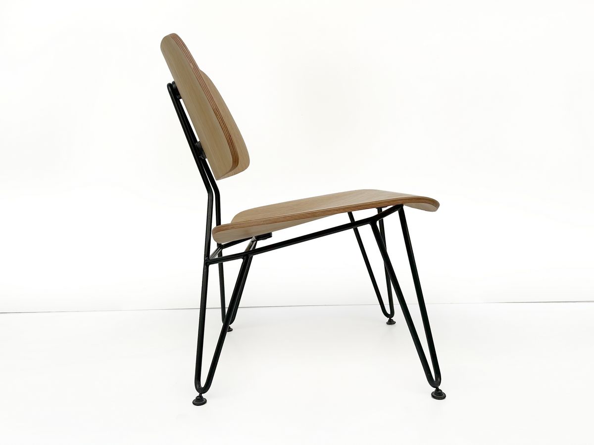 Dieser elegante Mid Century Modern Stuhl aus dem letzten Viertel des letzten Jahrhunderts besticht durch seine minimalistische Formensprache und die harmonische Kombination von Schichtholz und schwarzem Rundstahl. Der Lounge-Stuhl mit organisch geformter Sitz- und Rückenfläche steht auf ikonischen Hairpin Legs, die ihn zu einem echten Designklassiker machen. Der Stuhl erinnert an Entwürfe skandinavischer Designer oder der String-Ära und fügt sich stilvoll in moderne, industrielle oder minimalistische Wohnräume ein.
