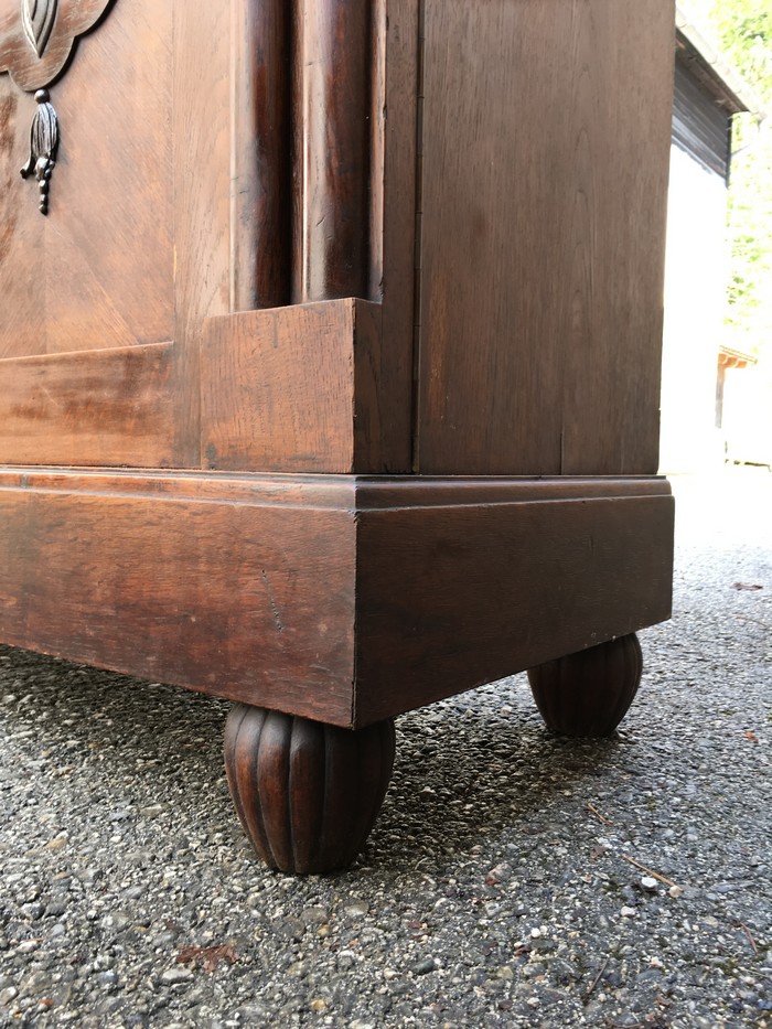 Schrank antik Nuss Historismus mit Marmorplatte beschnitzt Schrank antik, originales, antikes Buffet-Möbel, eine antike Anrichte mit Aufsatz in wunderbarer Ausführung. Die Entstehung dieser Kredenz liegt gegen Ende des 19. Jhdts (1880 - 1890) in der Zeit des Historismus. Das Buffet wurde mit schönem Nussholzfurnier versehen, das sich in sehr gutem Zustand befindet. Auch die Marmorplatte ist makellos und bestens in Schuß.Die Maße: Breite ca. 146 cm Höhe ca. 231,5 cmTiefe ca. 68 cm Das Schrankmöbel bietet reichlich Stauraum und sieht einfach wunderbar aus. Reichlich geziert mit Schnitzwerk, Kerbschnitzerei, breiten Lisenen und balusterförmigen Akanthusblattschnitzereien ist dieses Buffet bestimmt ein Hingucker. Alle Beschläge vorhanden und auch zwei Schlüssel gibt es zu diesem Schmuckstück. Eine kleine Absplitterung am linken Standbein des Oberteiles (siehe Bilder) sei noch erwähnt. Einige minimale Alters- und Gebrauchsspuren sind zwar vorhanden, doch in Anbetracht des doch stattlichen Alters ist der Zustand als absolut wunderbar zu bezeichnen. Imposanter Buffetschrank, der noch lange Jahre gute Dienste leisten wird.