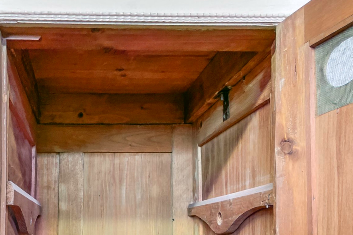 Der Schrank wurde uns so eingeliefert wie auf den Fotos zu sehen. Trotz seiner Alters- und Gebrauchsspuren sieht dieses authentische Vintage Möbel hinreißend aus und ist ein echter Hingucker. Die Fertigung als Steckschrank erweist sich als praktisch, dadurch das Möbel für den Transport zerlegt werden kann. So ist er dann auch bei Umzügen einfacher.
