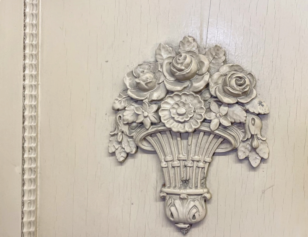 Die Türe des Mittelteiles ist mit einem facettierten Spiegel versehen. Die Türen sowie der Korpur sind mit aufwändigen Schnitzarbeiten in Form von Girlanden, Amphoren und Blattwerk versehen. Der Kleiderschrank besitzt auch eine Lade, die im Unterteil des Spiegelteiles angebracht wurden.