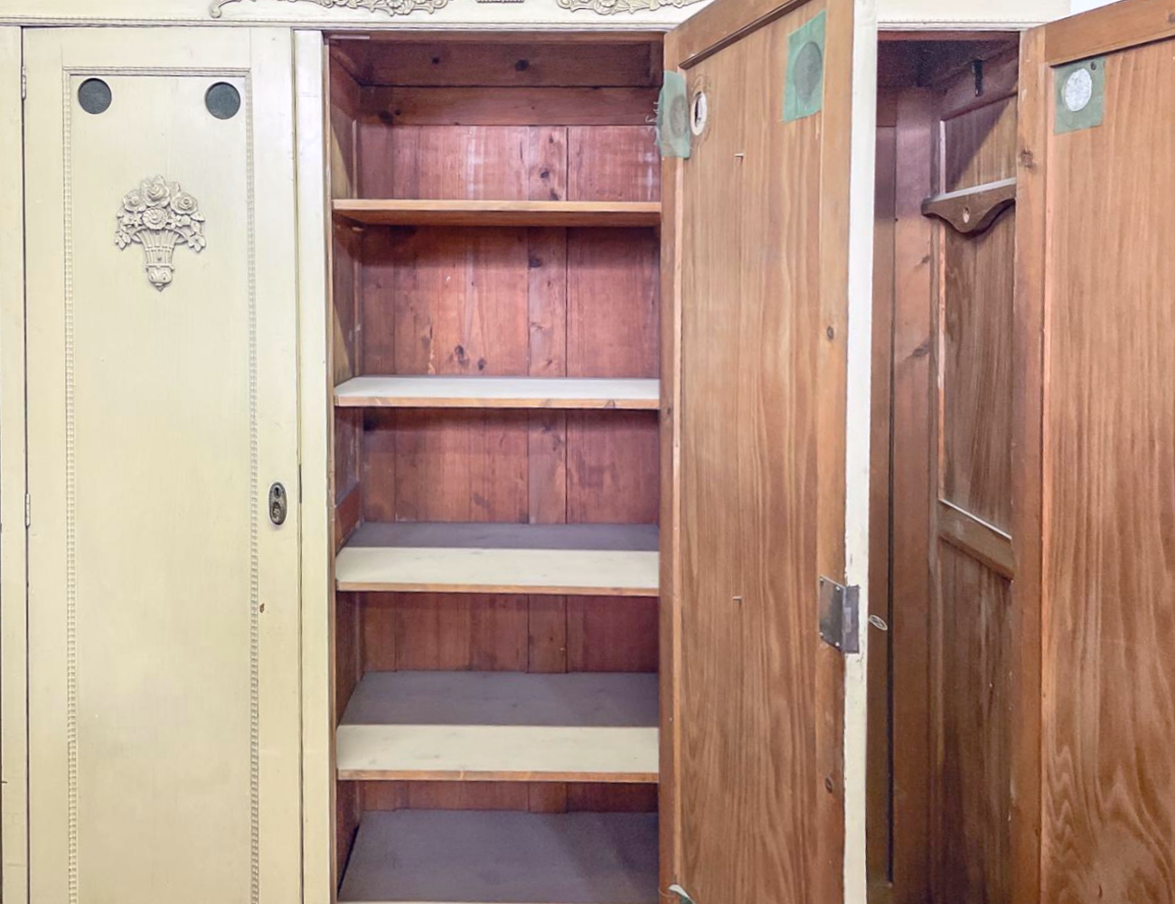 Kleiderschrank antik weiß Schrank mit Spiegel antik cremefarben Shabby Chic Antiker Kleiderschrank in wunderbarer Ausführung mit drei Türen aus der Zeit um ca. 1900. Absolut elegant wirkt dieser Schrank durch die geradlinige Formgebung. Der Schrank wurde vor nicht allzu langer Zeit vom Vorbesitzer cremefarben gefasst und steht nun in gutem Zustand mit geringen Gebrauchsspuren da. Der Garderobenschrank besitzt drei Türen wobei die Mitteltüre mit einem facettiertem Spiegel versehen ist. Der Mittelteil ist optisch vorkragend und somit ergibt sich das elegante Erscheinungsbild. Kleinere Gebrauchsspuren sind vorhanden, Schlüssel vorhanden und diese sperren alle Türen. Im Inneren besitzt der antike Schrank in jedem Teil eine Kleiderstange sowie je ein Fach über dieser Stange. Zusätzlich sind für die Seitenteile je zwei Fachbretter vorhanden, die mittels Zahnleiste höhenverstellt werden können. Die Innentiefe im Mittelteil beträgt ca. 50 cm und seitlich ca. 45 cm. Zerlegbarer Schrank:Der Schrank ist mit wenigen Handgriffen zerlegbar. Er besteht aus Bodenplatte, Haupt, zwei Seitenteile, zwei Innenteile und der Rückwand. Die Lieferung erfolgt zerlegt aber wie erwähnt ist die Montage in wenigen Minuten auch von Laien zu erledigen. Da könnte sich so manches skandinavische Möbelhaus noch etwas abgucken :) Einsatzmöglichkeiten: Ob als Kleiderschrank im Schlafzimmer, als Dielen- oder Garderobenschrank oder in die Küche als Vorratsschrank. Der Schrank ist ein Hingucker in jedem Bereich und durch die verspiegelte Mitteltüre bestens geeignet in allen Räumen wo man schnell noch mal einen Blick in den Spiegel werfen will bevor man das Haus verlässt. Umgestaltungsmöglichkeit:Wir haben ein Beispielbild erstellt, auf dem man sieht, wie der weiße Kleiderschrank aussehen würde, wenn man den Spiegel durch ein Glas ersetzen würde. Wir bieten jedenfalls den Schrank so an, wie er uns eingeliefert wurde nämlich in authentischem Zustand mit facettiertem Kristallglasspiegel. Bezaubernder, großer Kleiderschrank in eleganter Form mit Unmengen von Stauraum, der noch lange Jahre gute Dienste leisten wird und gewiss nicht unbeachtet bleibt. Besichtigung des Möbels gerne nach telefonischer Terminvereinbarung möglich.