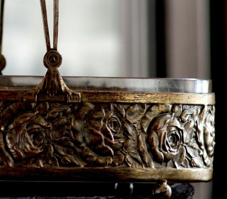 Hier bieten wir einen antiken Glasschalenkorb an mit umlaufenden, ornamentalen