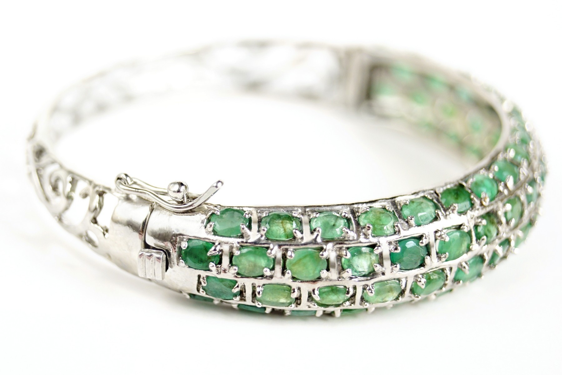 Jeder Smaragd wurde einzeln gefasst und oval geschliffen, um das natürliche Funkeln und die Tiefe der grünen Farbtöne zu betonen. Die getreppte Anordnung der Edelsteine auf dem Silberarmreifen sorgt für eine harmonische Balance und unterstreicht die zeitlose Eleganz dieses Schmuckstücks. So entsteht ein Accessoire, das Generationen überdauert.