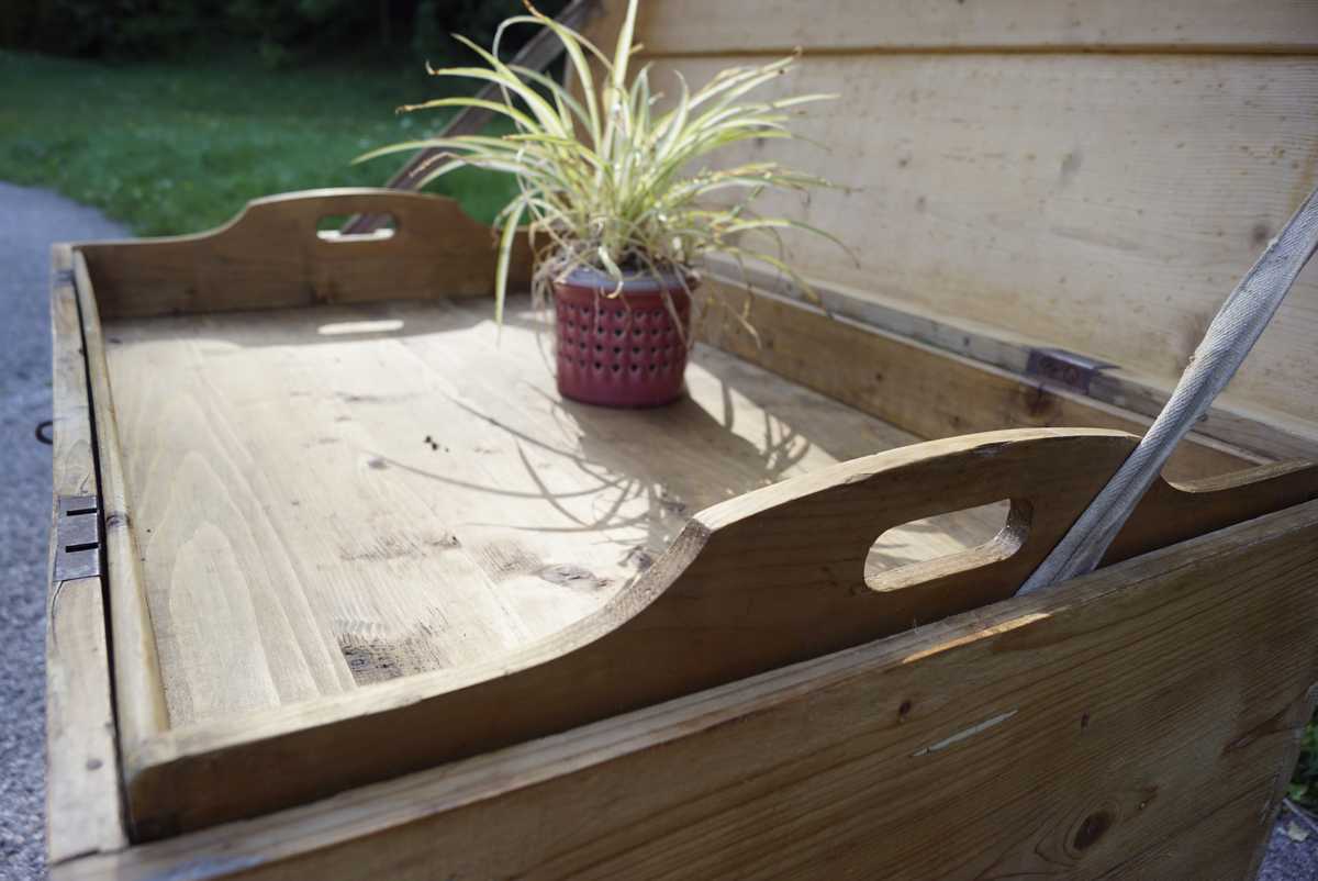 Im Inneren verfügt die Truhe über ein praktisches Innenfach, zwei kleine Laden sowie einen herausnehmbaren Einsatz (Tablett), was sie besonders funktional und auch selten macht. Das originale Schloss ist noch vorhanden, der Schlüssel jedoch fehlt. Dank ihrer stabilen Bauweise eignet sich die Truhe sowohl als stilvolles Aufbewahrungsmöbel als auch als dekoratives Element im Wohn- oder Schlafzimmer. Altersbedingte Gebrauchsspuren unterstreichen ihren authentischen Charakter und machen sie zu einem echten Unikat.