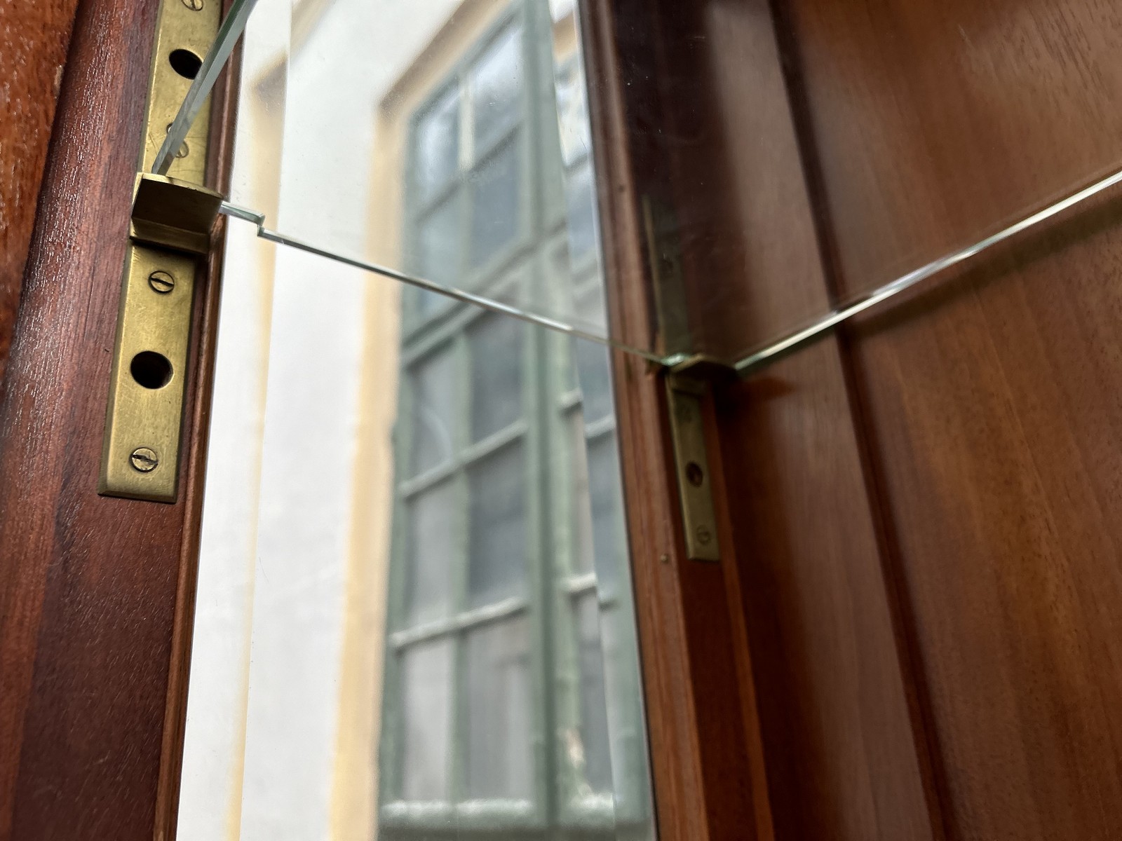 Stabil auf empirisierenden Füßen stehend, bietet die 3-seitig verglaste Vitrine einen perfekten Einblick in ihr Inneres. Die Bleigläser zaubern bei Lichteinfall wunderschöne, farbige Lichtreflexe.
