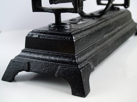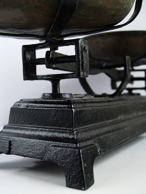 Hier handelt es sich um eine große Waage gefertigt wohl zur Zeit des Historismus aus Gusseisen mit Messingschalen in bezauberndem Zustand mit altersgemäßen Gebrauchsspuren und natürlich auch entsprechender Patina.